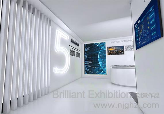 集團產品展館的改造設計更強調展陳形式為產品服務,用白藍調性體現簡約、科技,賦予空間張力,素色更好突出展品和展陳內容,局部深色搭配體現空間的縱深,曲線勾勒出空間的靈動,強化展陳的活力,展現南瑞集團發展的源動力。