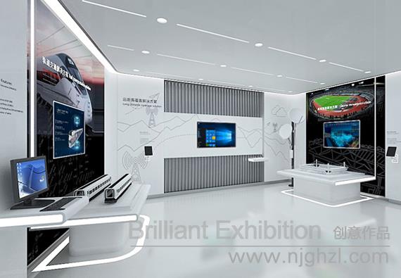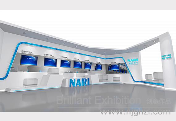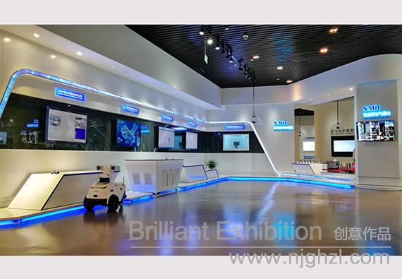 集團產品展館的改造設計更強調展陳形式為產品服務,用白藍調性體現簡約、科技,賦予空間張力,素色更好突出展品和展陳內容,局部深色搭配體現空間的縱深,曲線勾勒出空間的靈動,強化展陳的活力,展現南瑞集團發展的源動力。